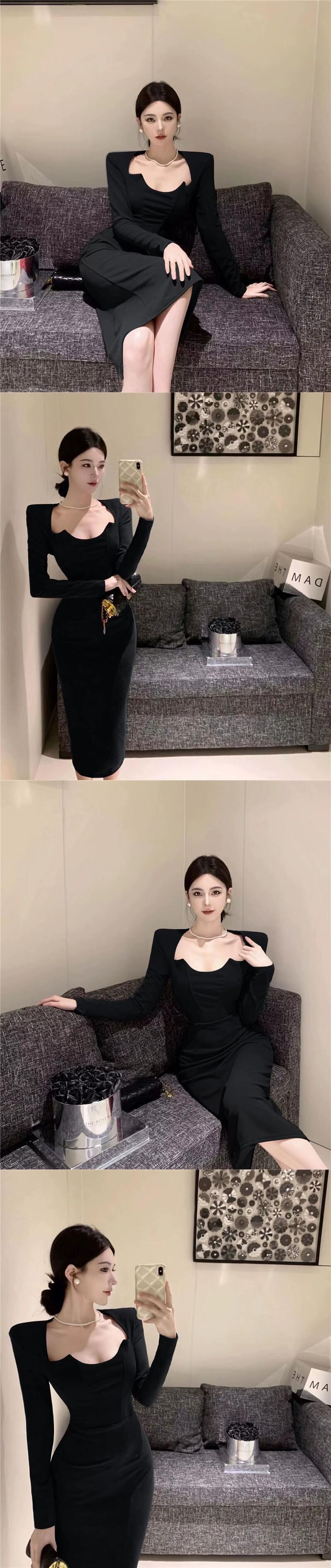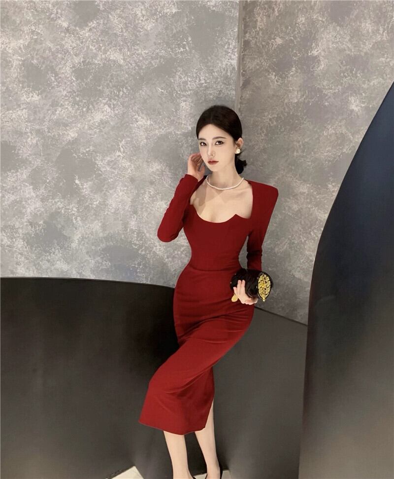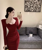 年次総会赤いイブニングドレスハイエンドライトラグジュアリースモールハイエンドトーストウェアフレンチセクシースクエアネック長袖ドレス ロング レッド スクウェア yeyij91677838034