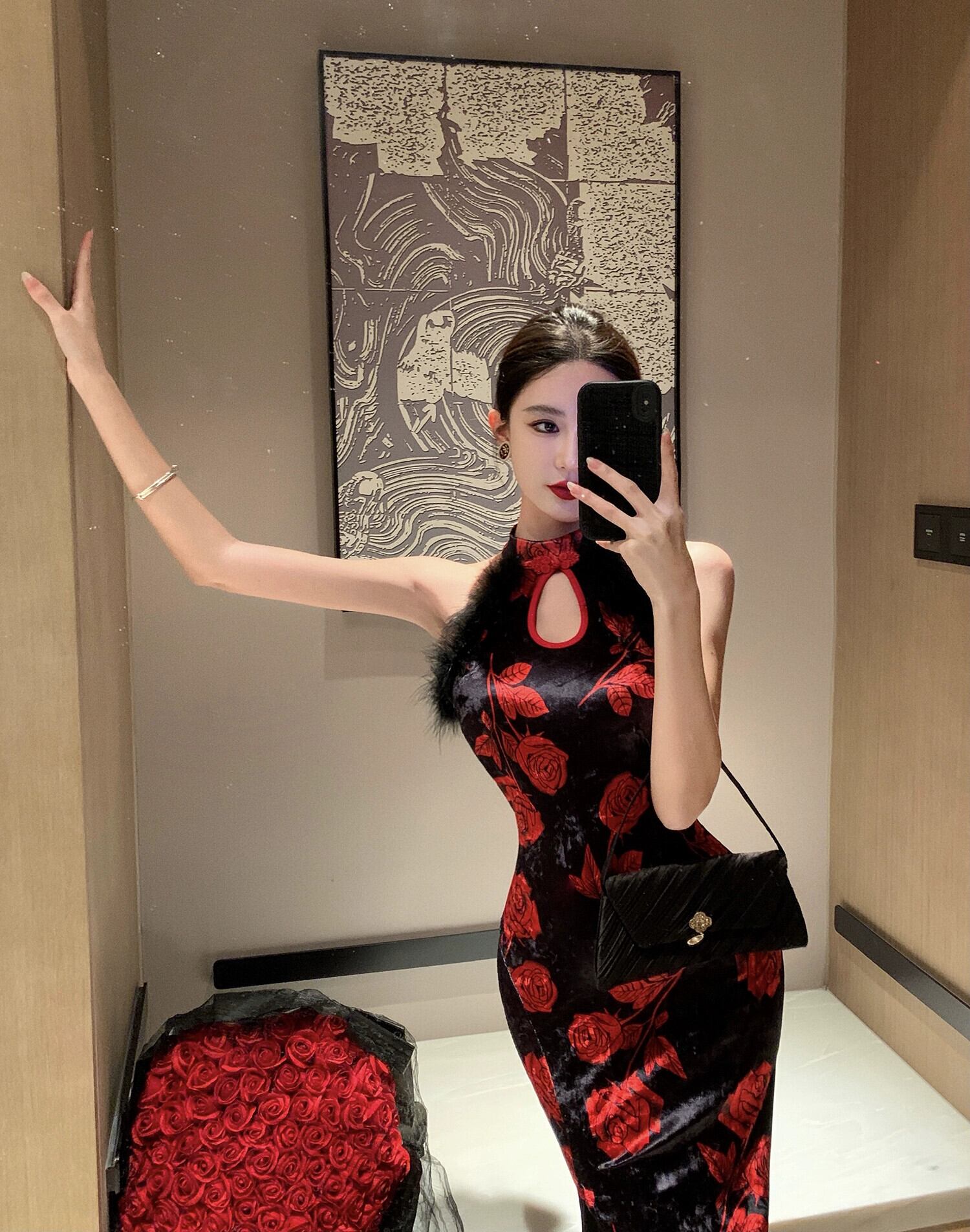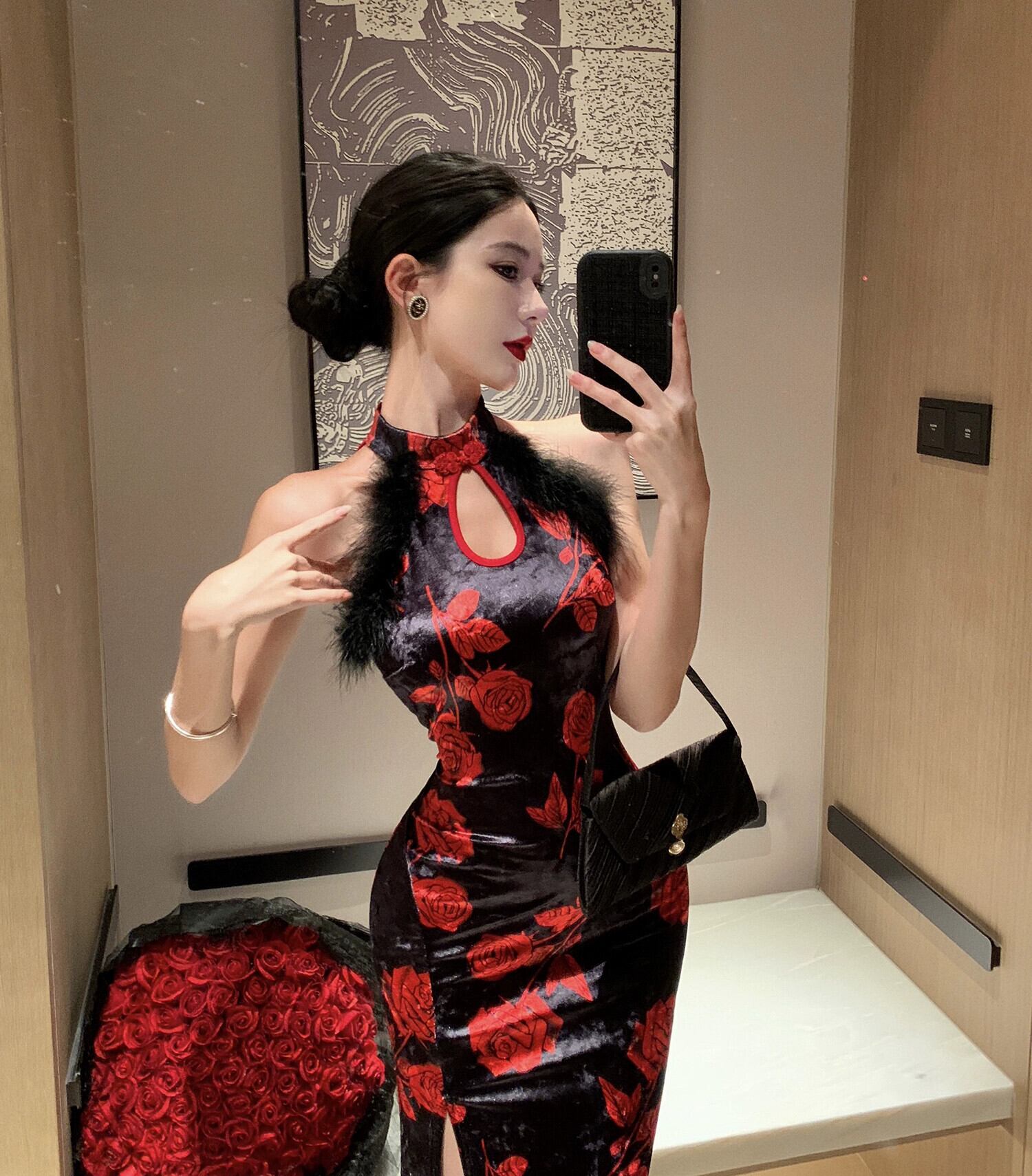 生放送服女性アンカー pogenic イブニングドレス若いセクシーなスリットゴールドベルベット改良版チャイナドレス yeyij23293461547