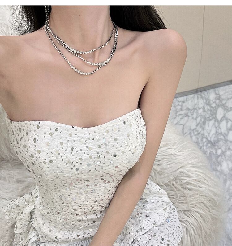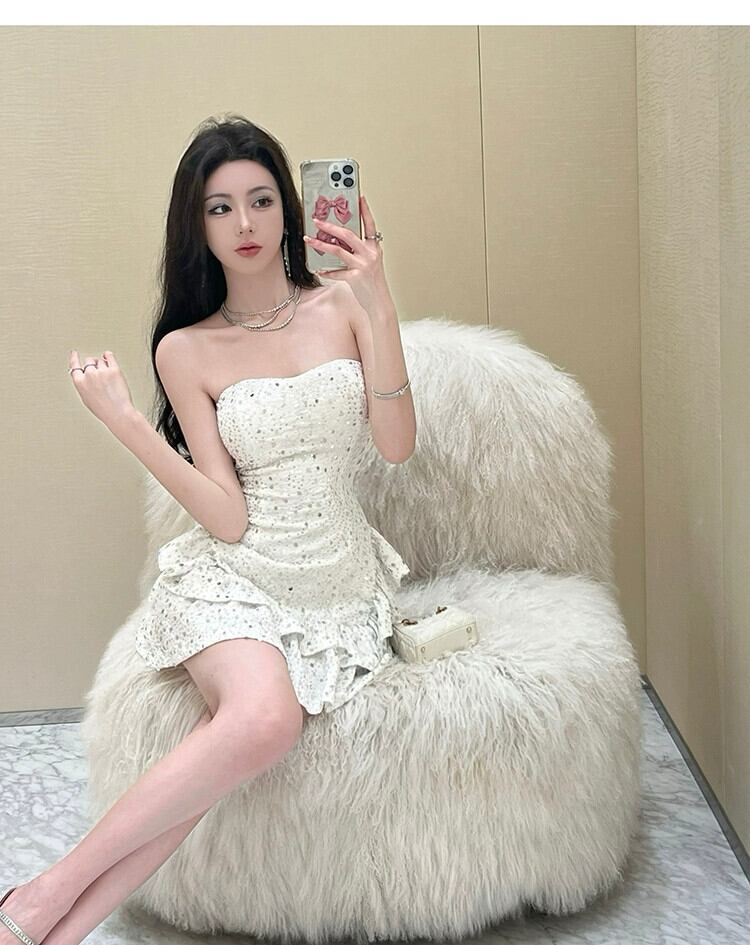 誕生日ドレス、白いイブニングドレス、ハイエンドのライトラグジュアリーニッチ、ハイエンドのスパンコール付きセクシーなショートチューブトップドレス ホワイト yeyij85412490549