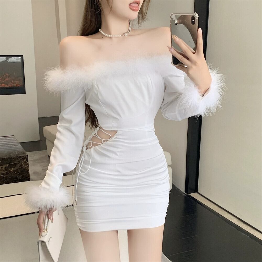 生放送服女性アンカー pogenic ハイエンド秋と冬のイブニングドレス長袖セクシーな毛皮のようなワンショルダードレス ロング オータム 秋物 ウィンター 冬物 yeyij70584293087