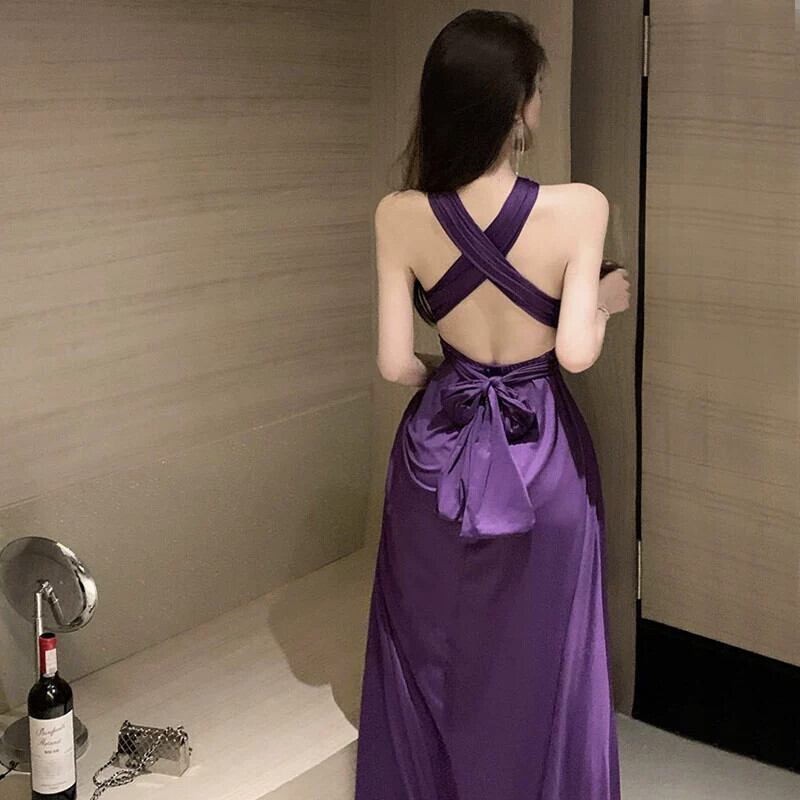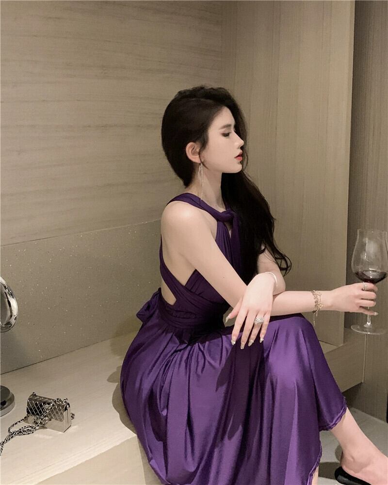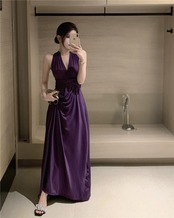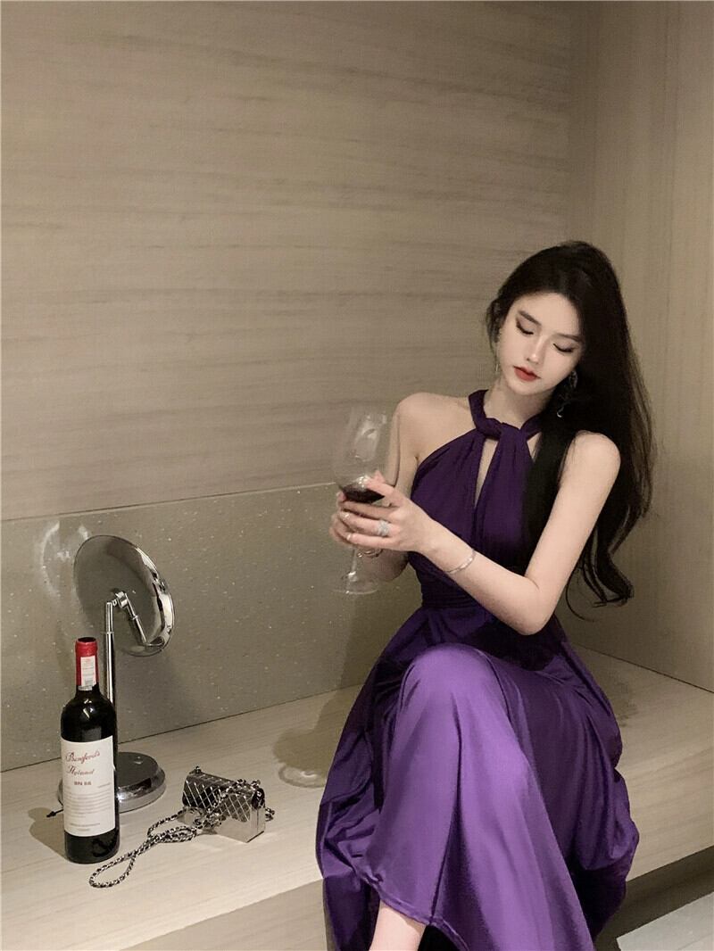 イブニングドレス、ライトラグジュアリーニッチハイエンドトーストドレス、ロングドレス、エレガントレディパープルセクシーバックレスホルターネックドレス yeyij91288540538