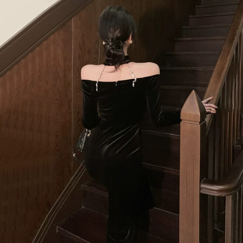 ヘップバーンスタイルの黒のイブニングドレス、ハイエンドの軽い贅沢、ニッチセレブの気質、セクシーなゴールドベルベットのオフショルダーホルターネックドレス ブラック yeyij1912194831