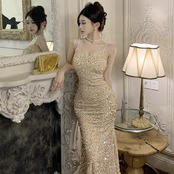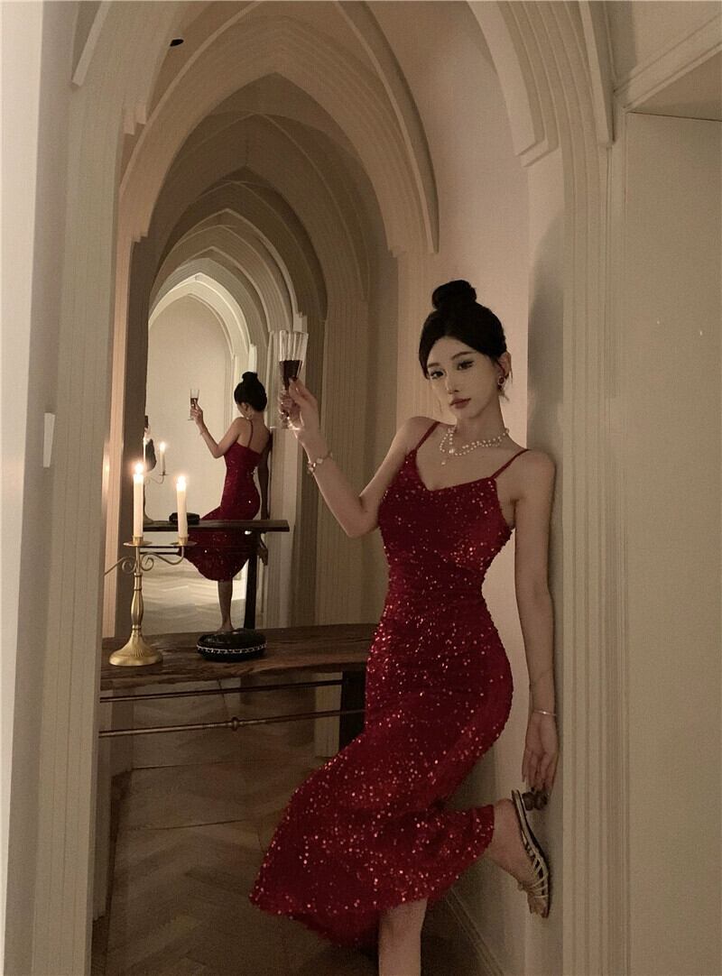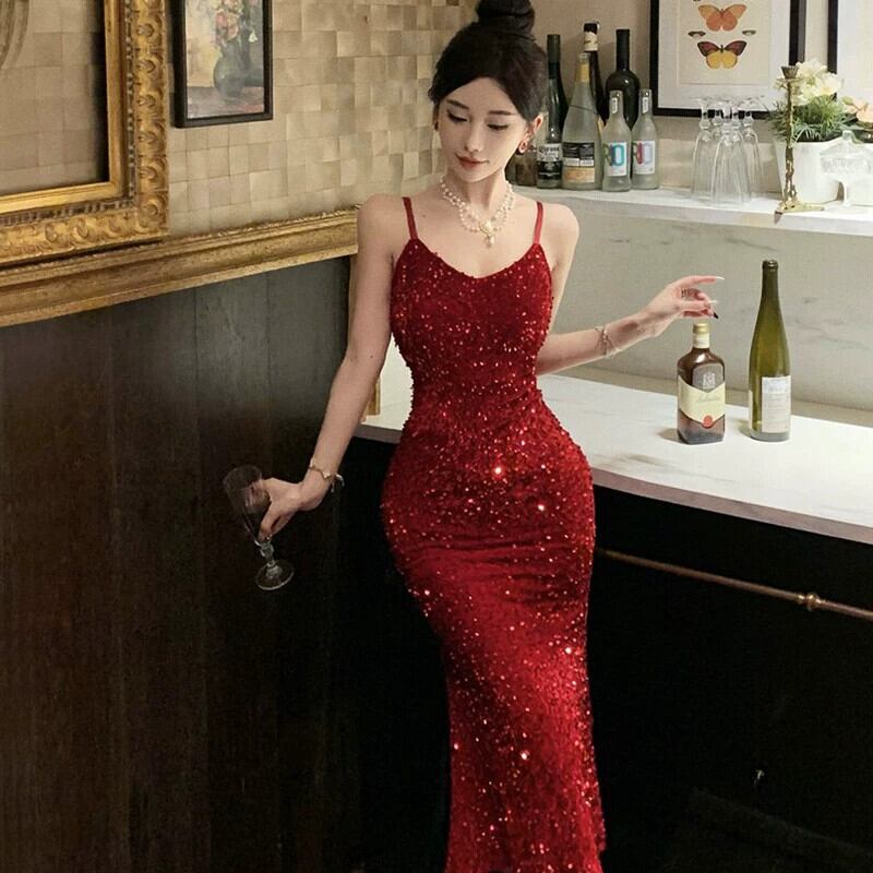 赤いスパンコールのイブニングドレスの女性のクリスマスとイヤーパーティーロングドレスハイエンドの気質スリムセクシーなサスペンダードレス レッド yeyij51217329332