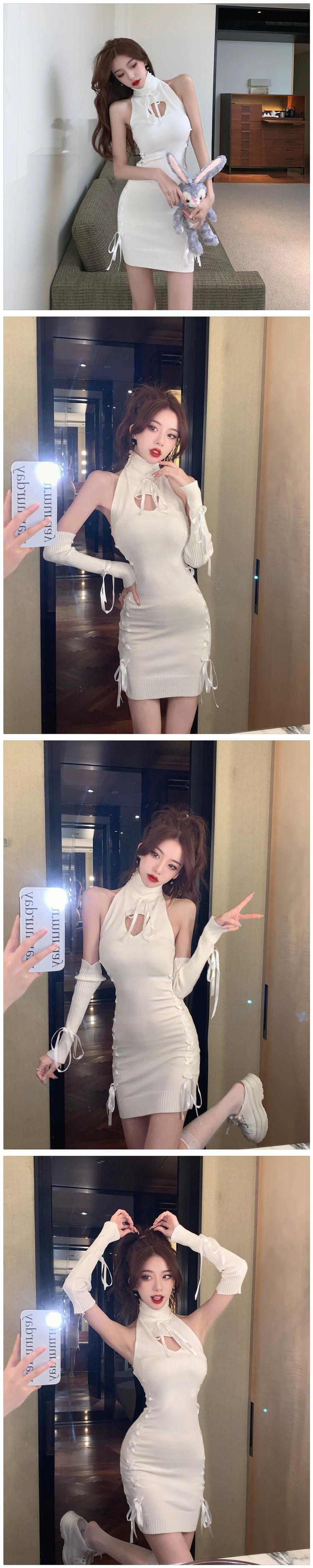 生放送服女性アンカー pogenic ハイエンド純粋な欲望ネクタイセクシーなオフショルダーハイネックニットお尻カバードレス ピュア yeyij27154541059