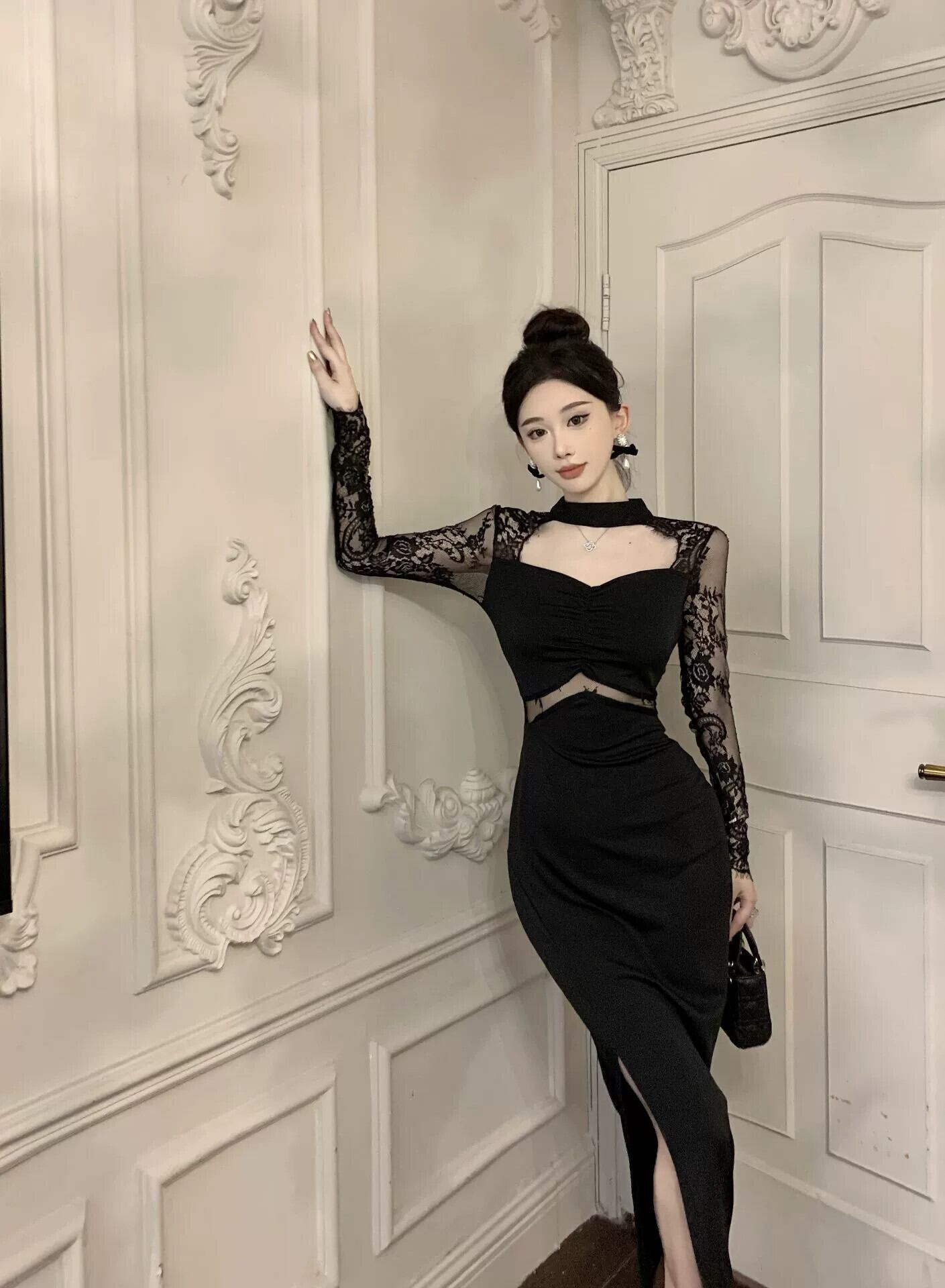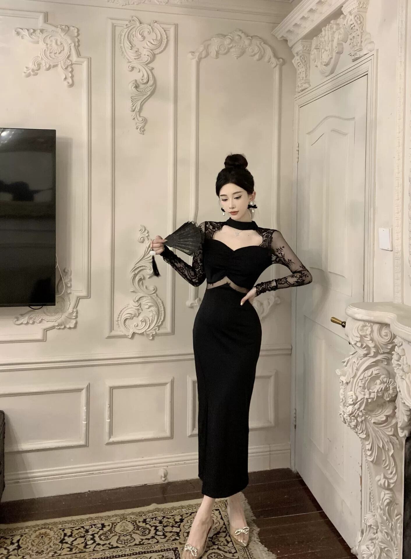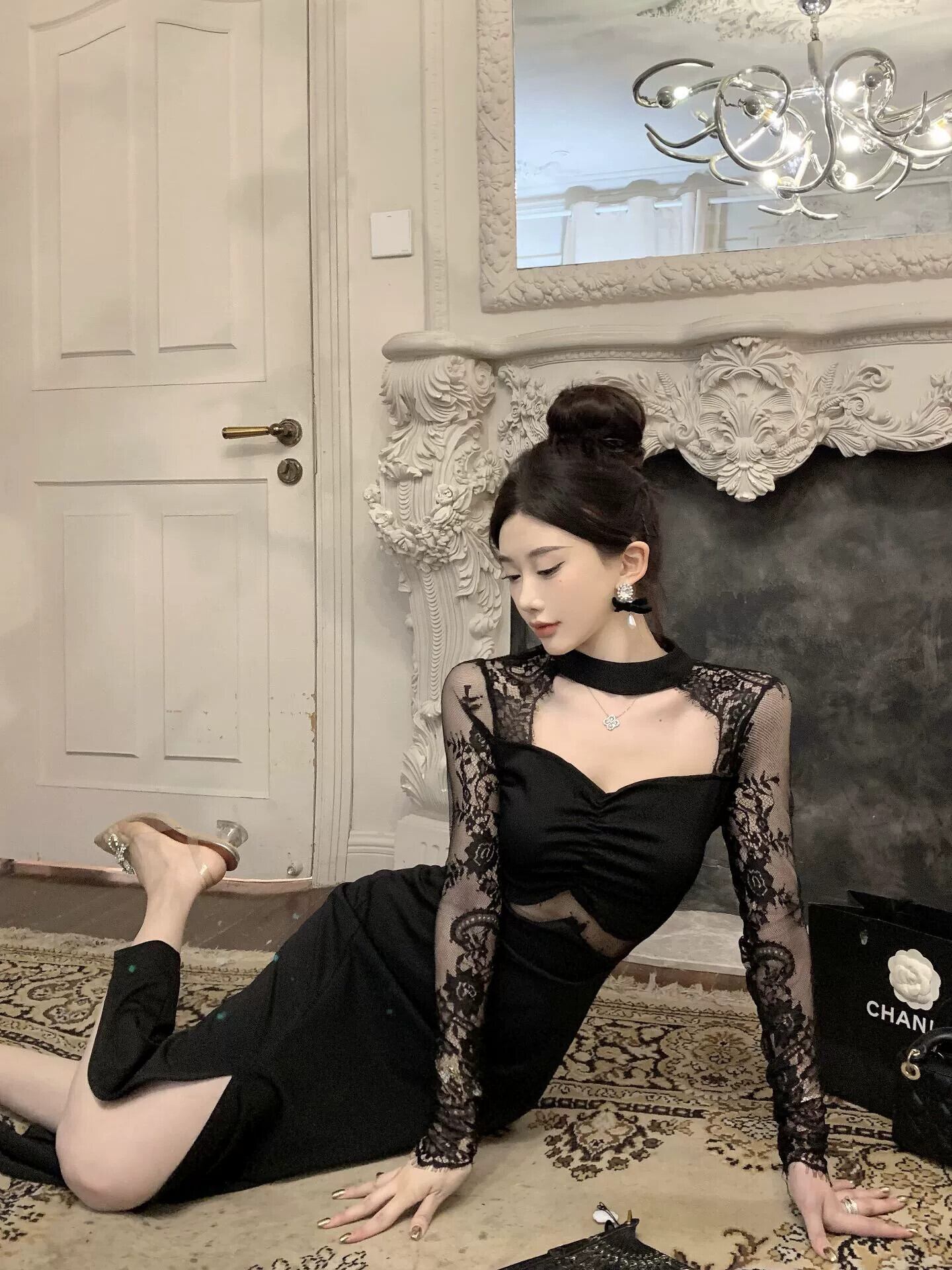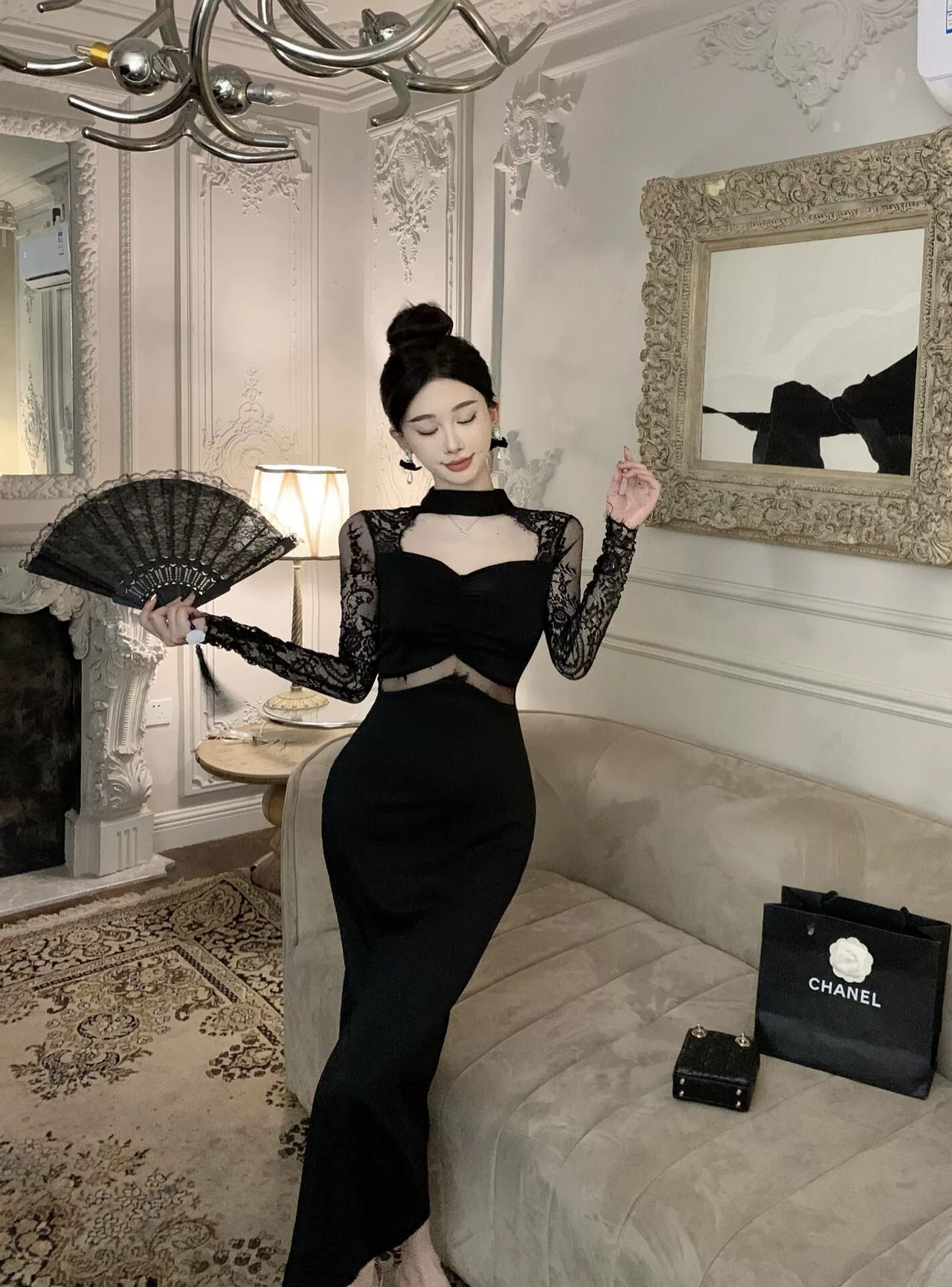 黒のチャイナ イブニング ドレスの女性、年次総会中国風のセクシーなレースのスプライシング ホルター ネック ドレスの高度なバージョン ブラック yeyij68359392913
