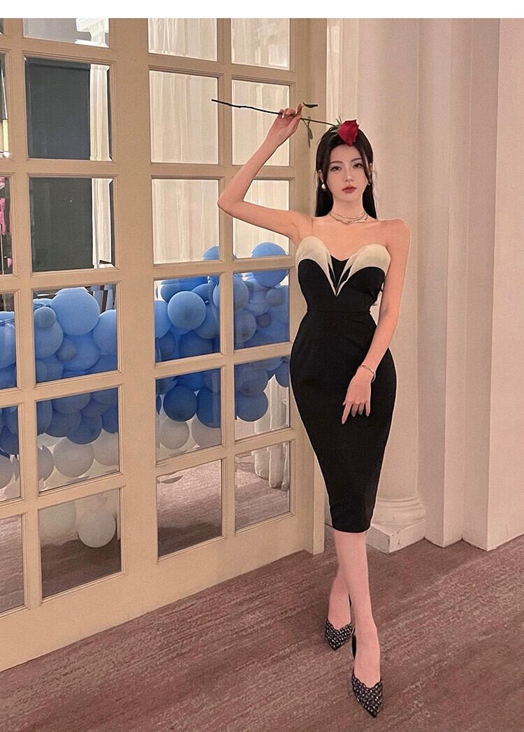 ヘップバーンスタイルのイブニングドレス、フェミニン、ライト、ラグジュアリー、ニッチ、ハイエンド、フレンチスタイルのセクシーなブラックのミドル丈チューブトップドレス yeyij61509128775