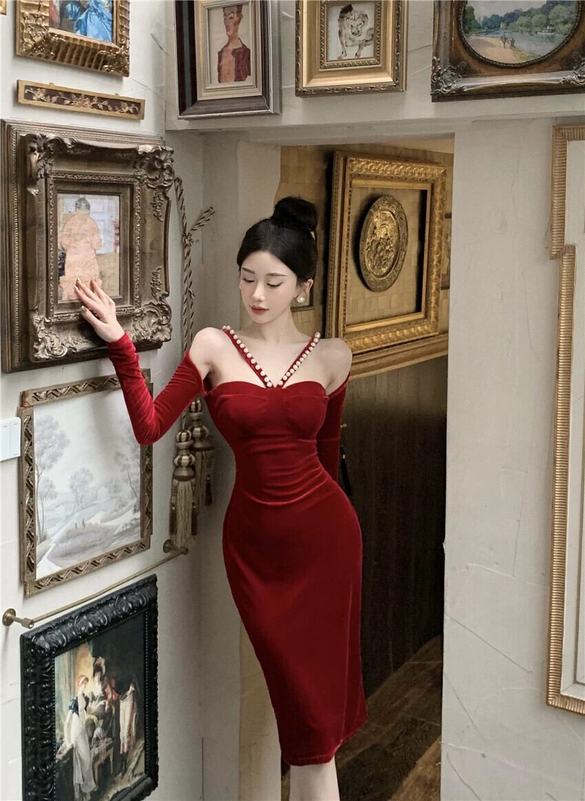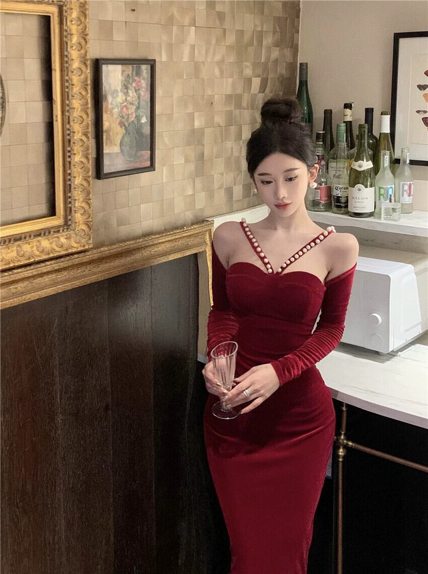 イブニングドレスの女性 2023 新しいハイエンドレッドクリスマスと年パーティーゴールドベルベットのセクシーなチューブトップサスペンダードレス yeyij6393973655