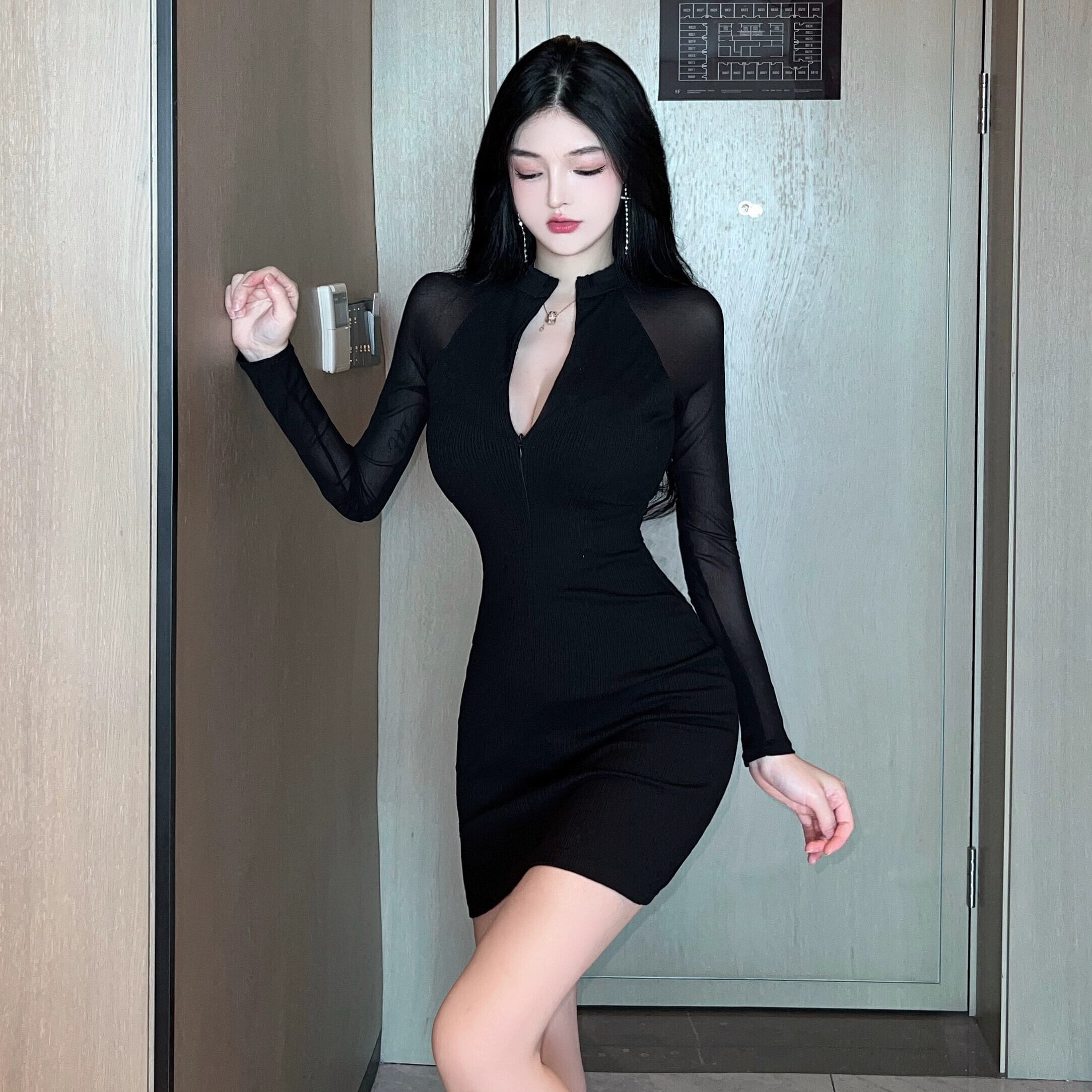 生放送服女性アンカー pogenic ハイエンド純粋な欲望黒のセクシーなメッシュスプライシング長袖ヒップドレス ロング ブラック ピュア yeyij20677238776