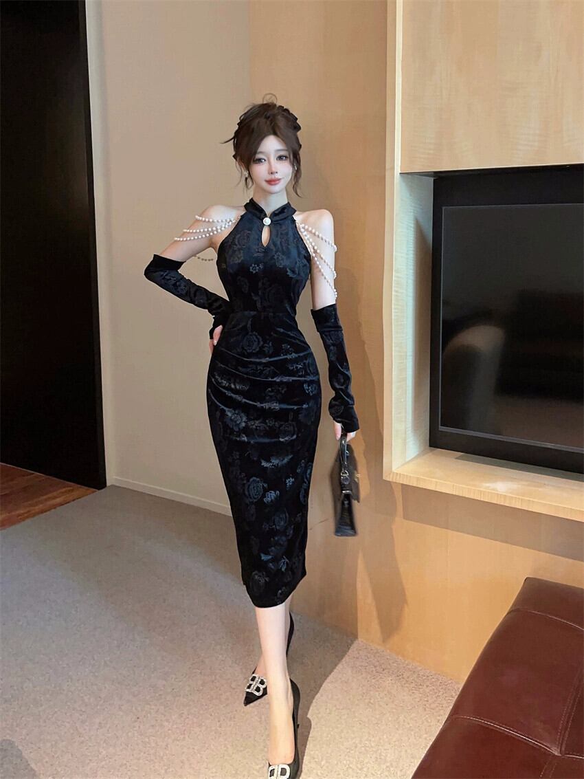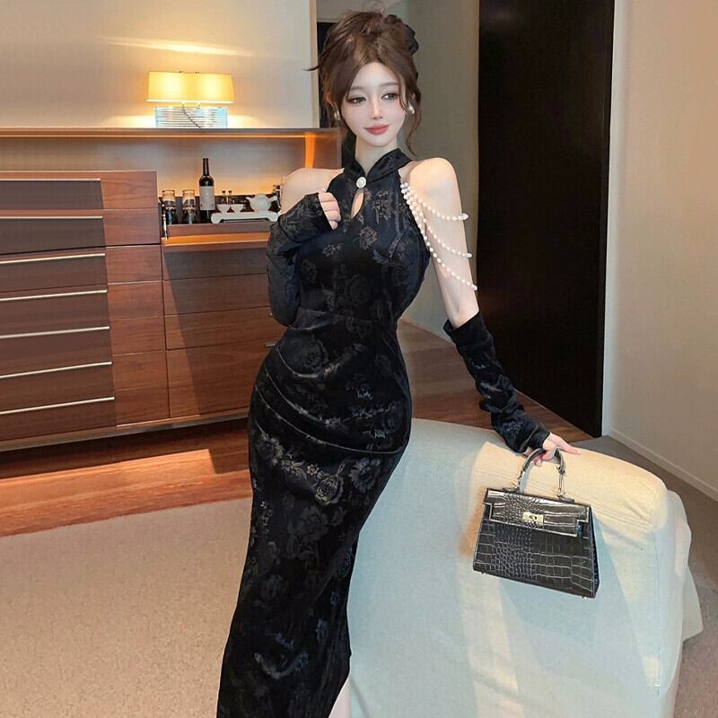 ニッチバンケットイブニングドレス女性、ハイエンド、若くてセクシーなオフショルダーゴールドベルベット修正された黒チャイナドレス ブラック yeyij12100664206