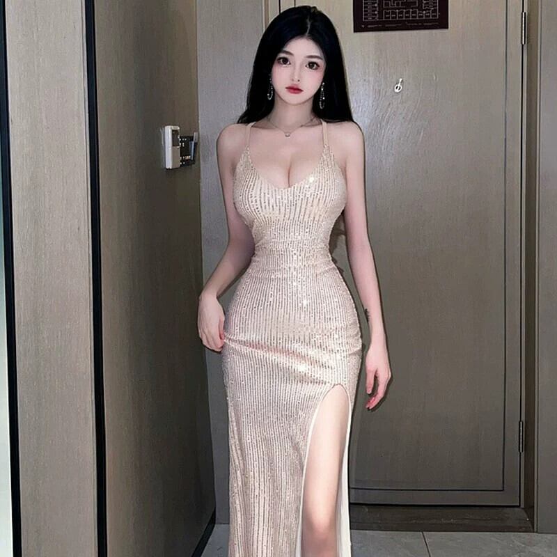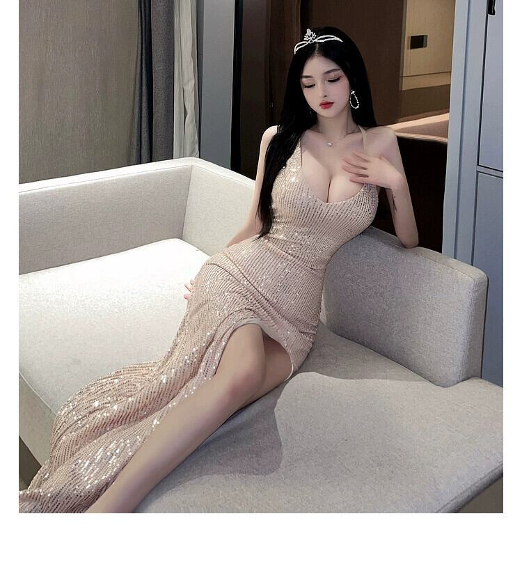 ナイトクラブドレス女性のナイトクラブ作業服セクシーなローカットディープ V ネックスパンコールヒップカバーサスペンダーロングスカート Vネック yeyij64728431886