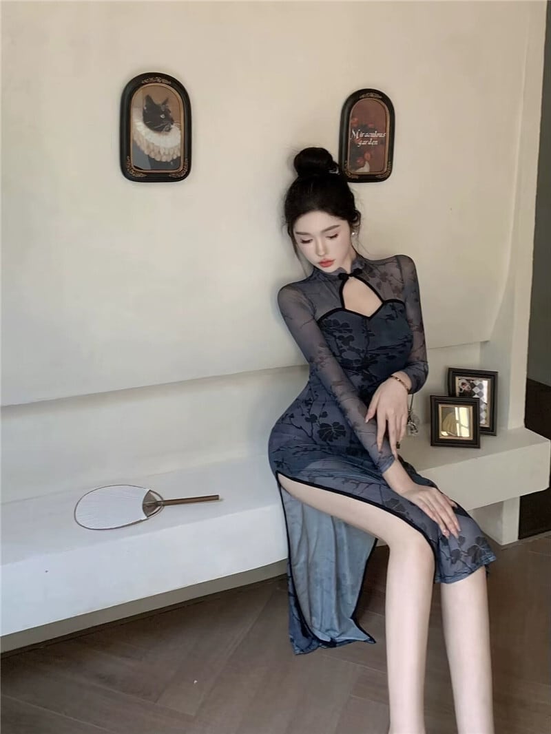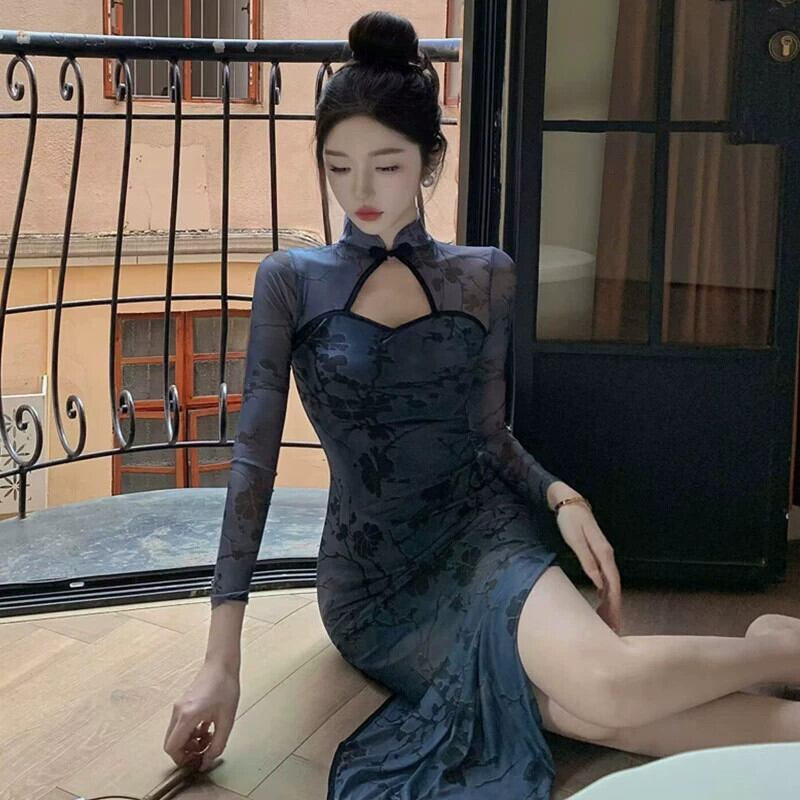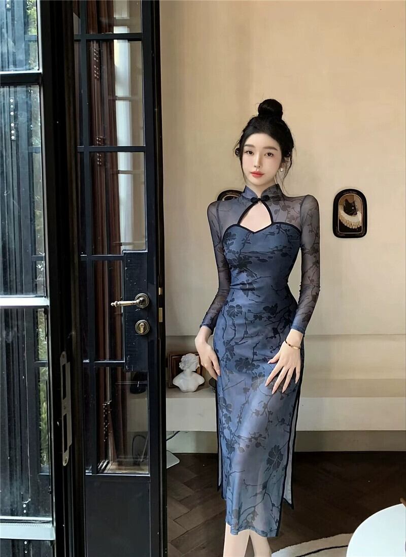 Pogenic 服装生放送女性アンカー、ハイエンドの若いスタイルのセクシーな中空メッシュ スプライシング改良版チャイナ ドレス yeyij1674592170