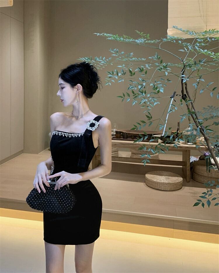 ヘプバーンスタイルのフレンチブラックイブニングドレスの女性、ハイエンドのダイヤモンドがちりばめられたゴールドベルベットのセクシーなワンショルダーストラップレスドレス yeyij11292395411