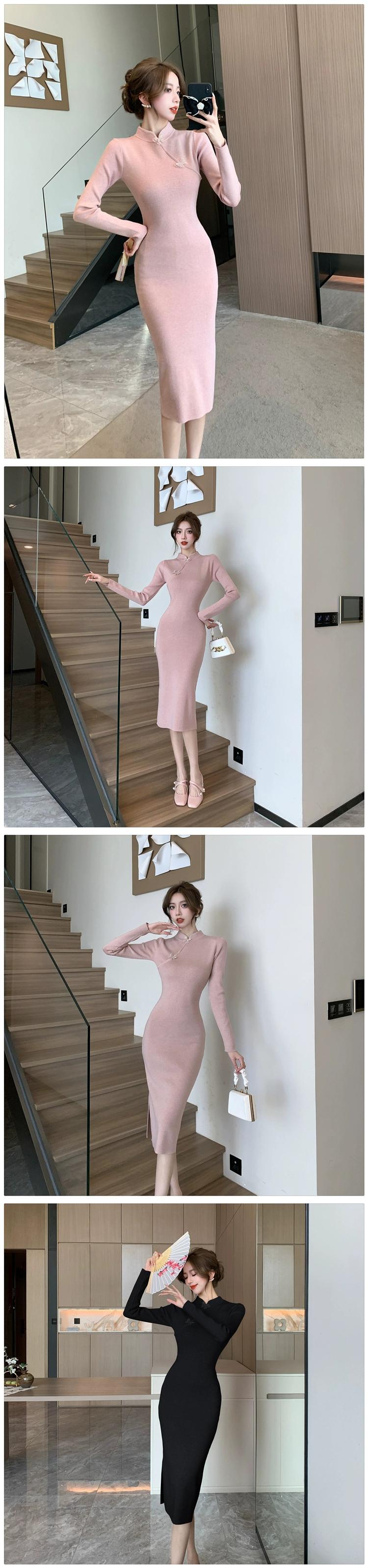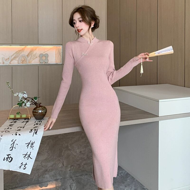 チャイナドレス女性の改良版、新しい中国風の秋服、若い日常着、ミドル丈のニットボトムドレス オータム 秋物 yeyij87119854054