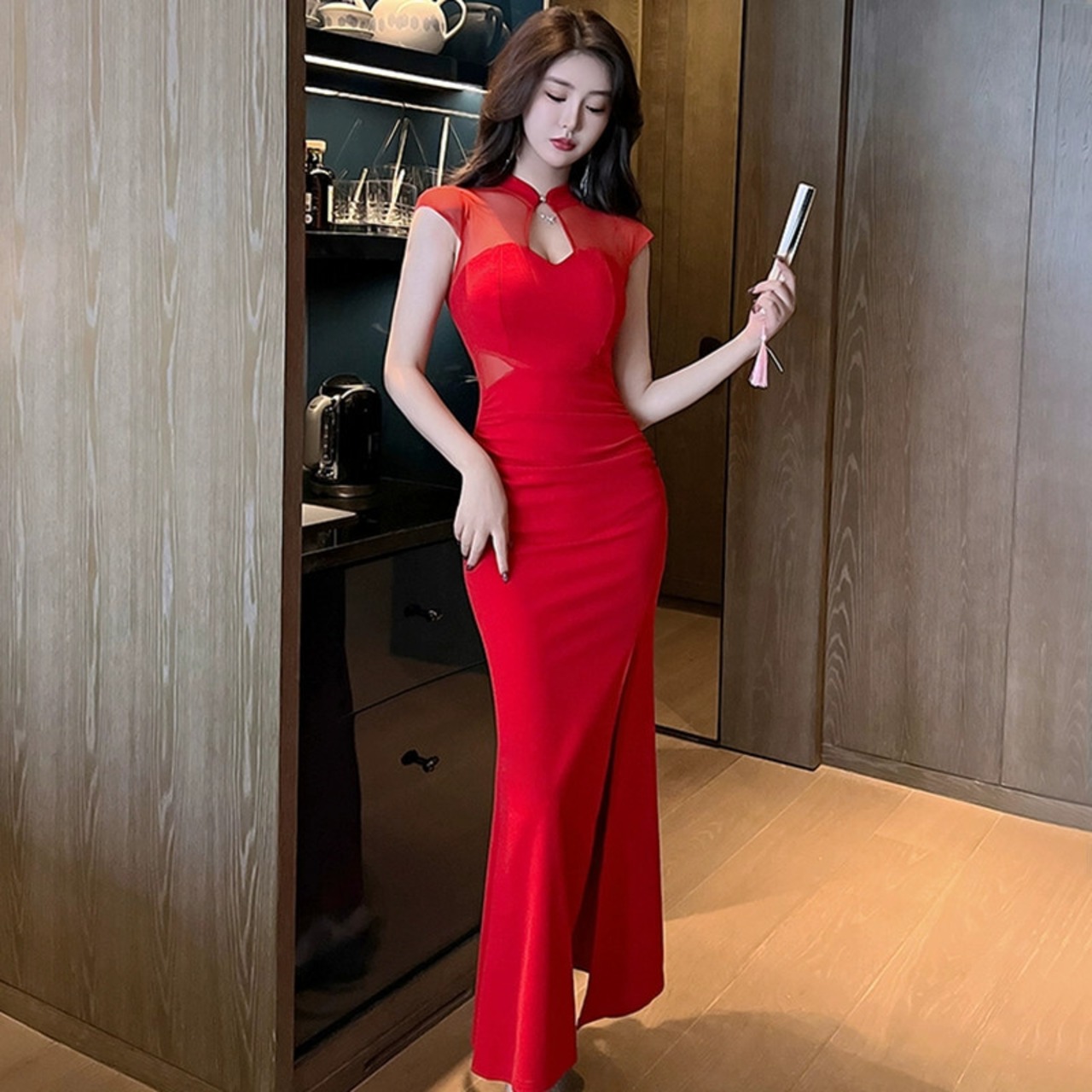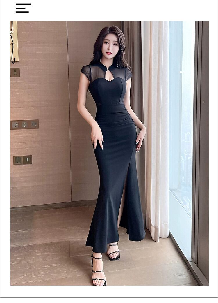 中国風のイブニングドレスの女性、高級ナイトクラブの気質、セクシーなロングスカート、メッシュスプライシング、チャイナドレスの改良版 yeyij19841845594