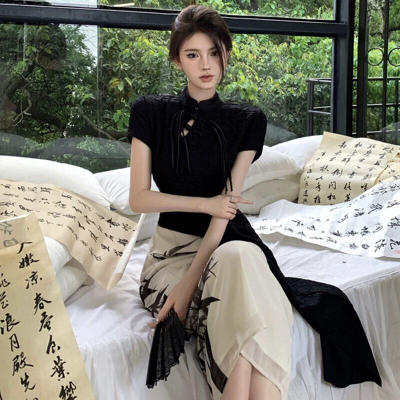 中国風中国風水墨画改良チャイナドレス女性の夏の若いスタイル偽ツーピースハイエンドロングスカート サマー 夏物 yeyij81244039497