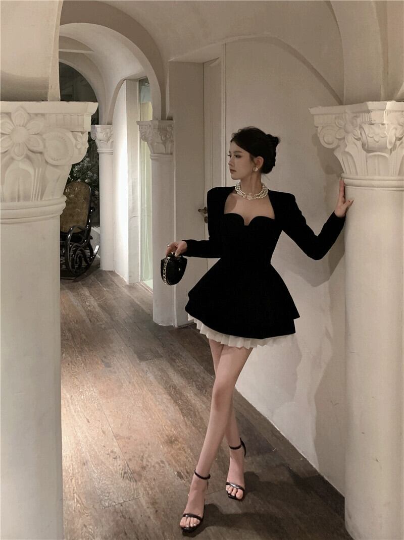 フレンチドレス小さなイブニングドレスの女性、ハイエンドヘップバーンスタイルの黒のセクシーなスクエアネックウエストスリミングふくらんドレス ブラック スクウェア yeyij22028294853