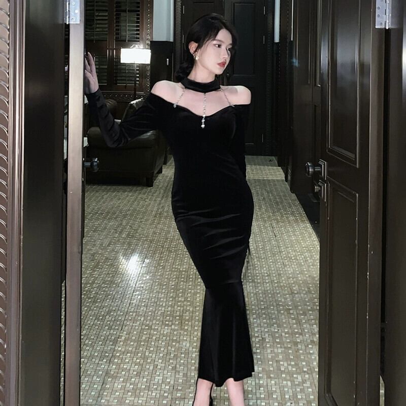 ヘップバーン スタイルのイブニング ドレス、フェミニン、ライト、ラグジュアリー、ニッチ、ハイエンド、フレンチ セクシーなブラック オフショルダー ホルター ネック ドレス yeyij52011209205