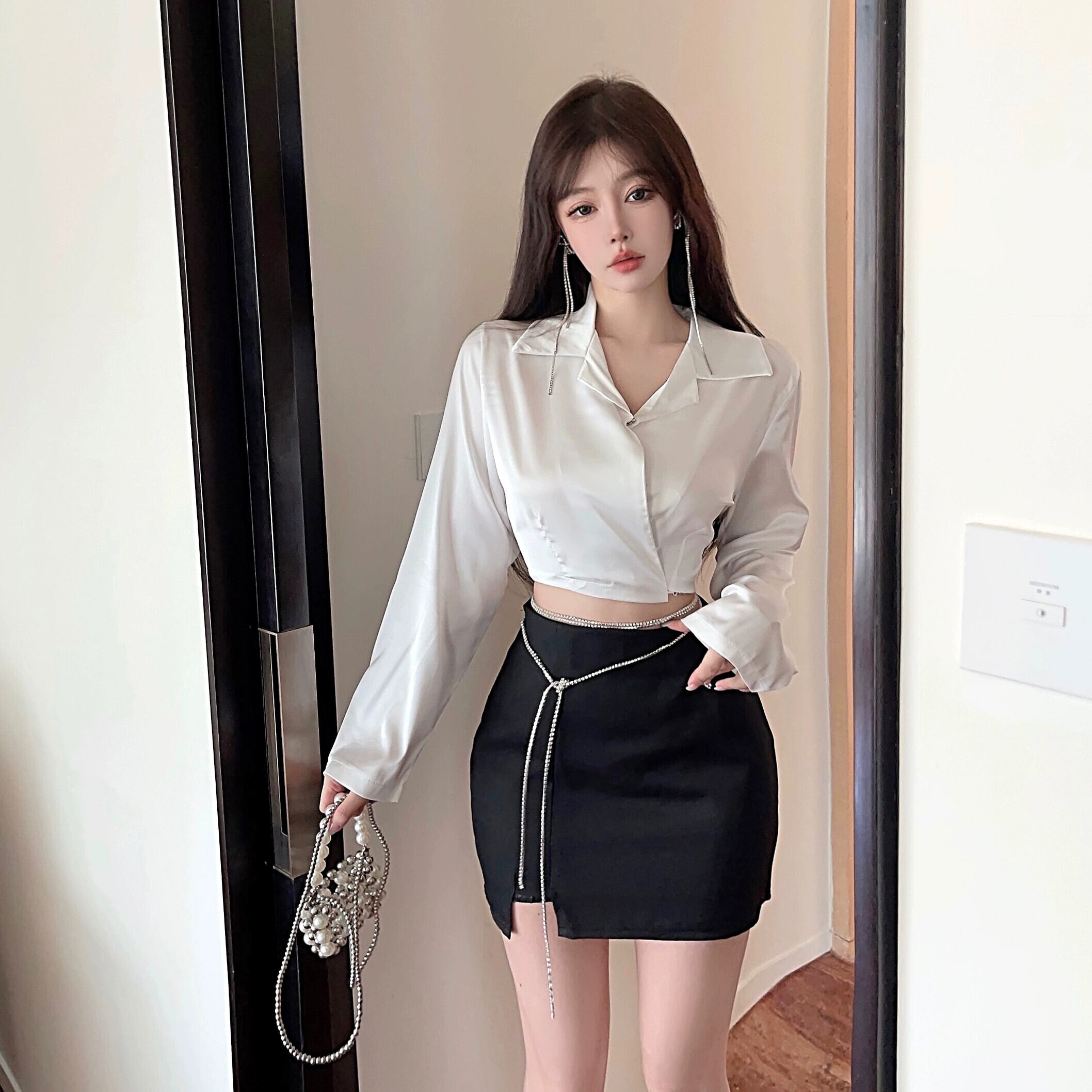 ホットスーツ女性の秋の新しい純粋な欲望のデザインへそ出しトップショート白シャツショートスカート 2 点セット ホワイト オータム 秋物 ピュア yeyij55732673748