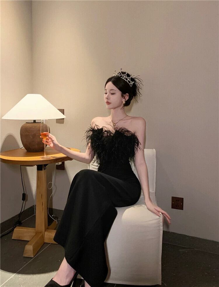 フランスのハイエンド社交界のイブニングドレスの女性の秋と冬 2023 新しいヘップバーンスタイルのスリムワンショルダードレス オータム 秋物 ウィンター 冬物 yeyij13699079519