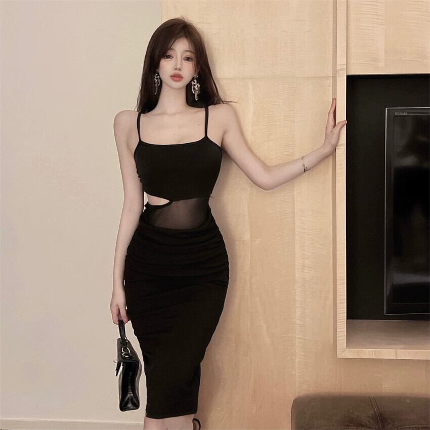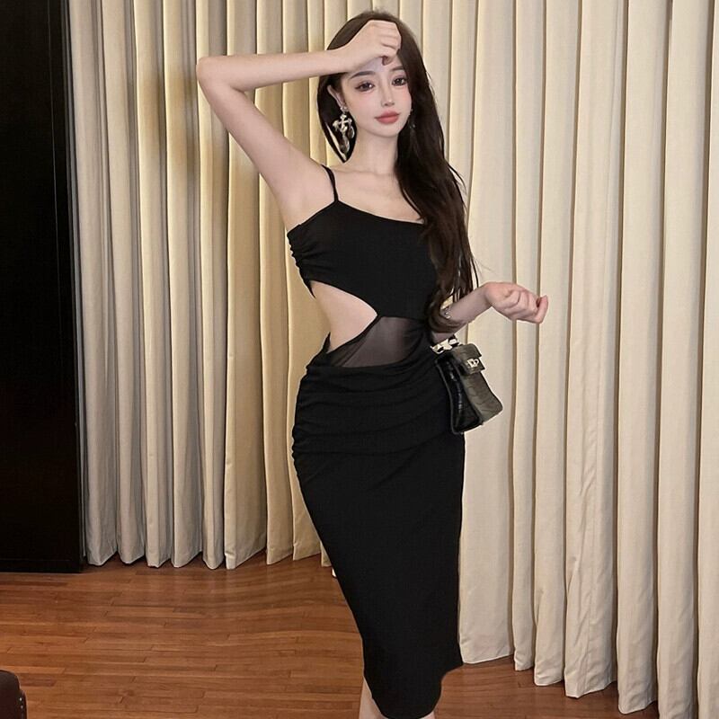 黒のイブニングドレス、女性の旅行と休暇のドレス、セクシーな中空ウエスト、メッシュスプライシング、ミッドレングスのサスペンダードレス ブラック yeyij11672724711