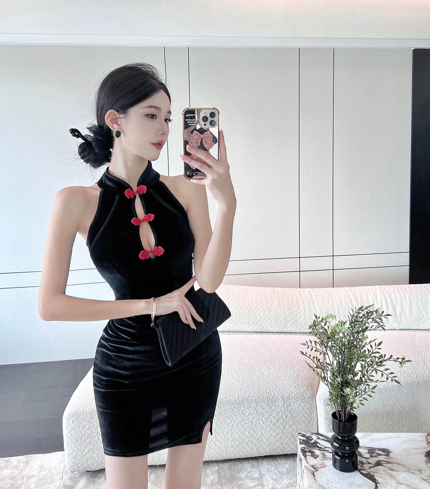 生放送服女性アンカー服黒セクシーな中空若いスタイルオフショルダーチャイナドレス改良版 ブラック yeyij89647511341