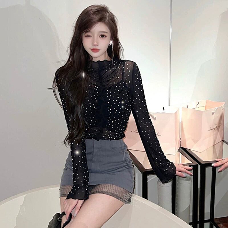 今年初秋の有能な年齢を減らすトップス女性の人気の黒のニッチ純粋な欲望メッシュダイヤモンドセクシーなシースルーシャツ ブラック オータム 秋物 ピュア yeyij57085487346
