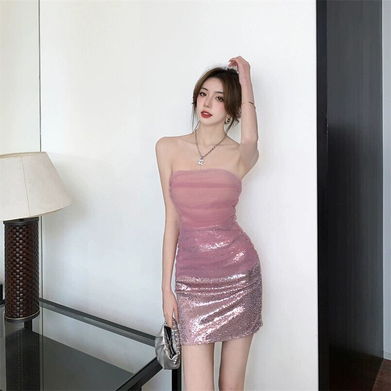 イブニングドレスの女性のハイエンドパーティーパーティーキラキラスパンコール気質セクシーなワンラインショルダーバッグヒップチューブトップドレス yeyij15973631008