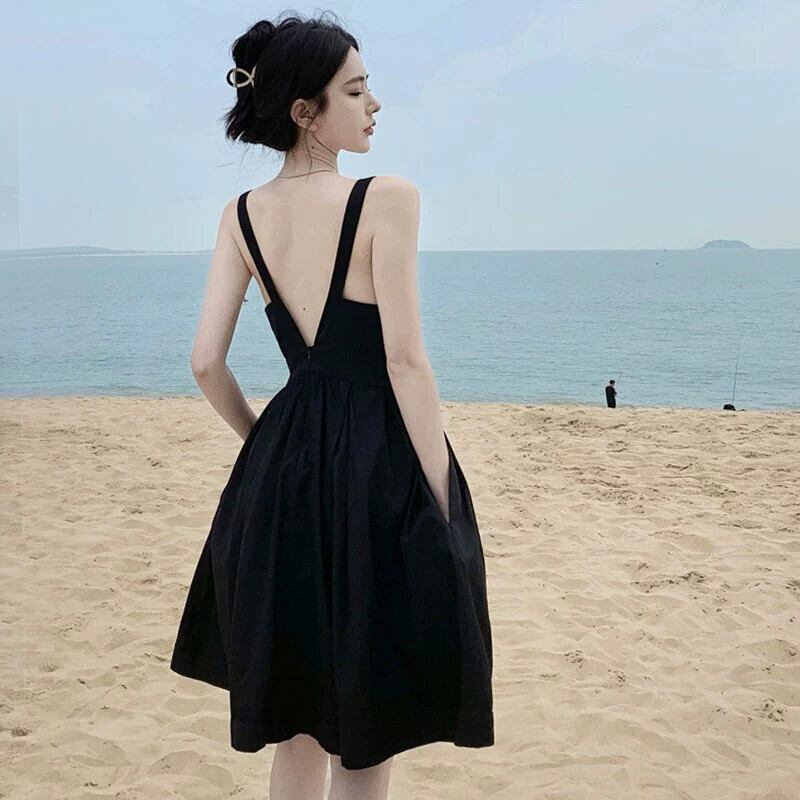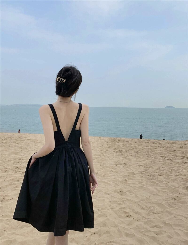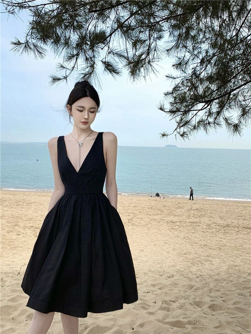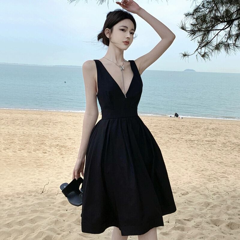 海辺の休暇黒サスペンダードレス女性の夏のセクシーな大きな V ネック背中の開いたフレンチ ヘップバーン スタイルの高級感 ブラック サマー 夏物 Vネック yeyij828895867