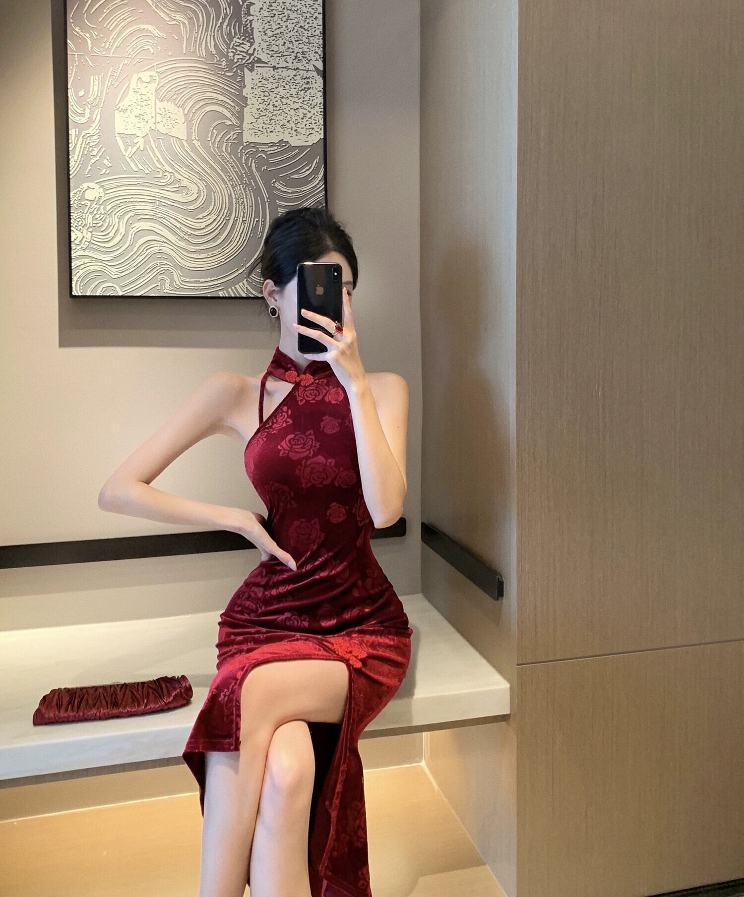 赤いチャイナドレスイブニングドレス女性年次総会ニッチバンケット改良版ゴールドベルベット中国風のセクシーなホルターネックドレス レッド yeyij28453998405