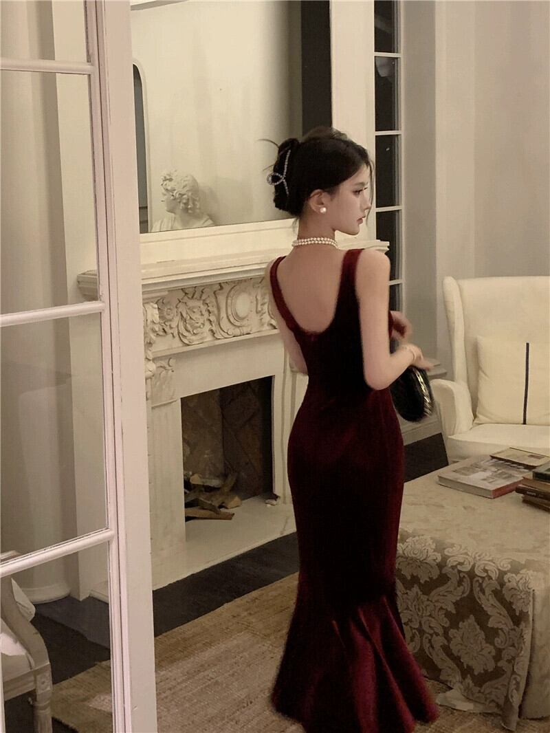 バンケットイブニングドレス、高級フランス年次パーティートーストドレス、バーガンディゴールドベルベットのミドルレングスサスペンダードレス yeyij31289896734