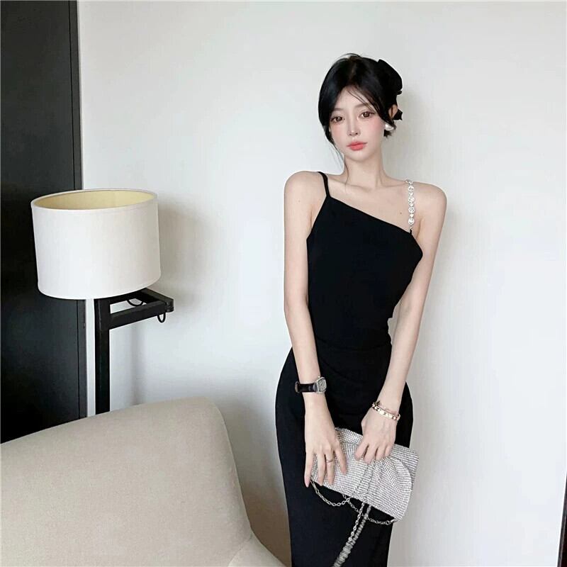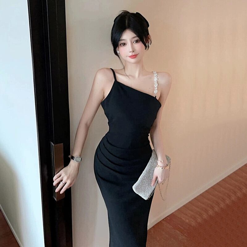 黒のイブニングドレスロングスカート女性ハイエンドライト高級ニッチハイエンドセンススリムでセクシーなスラントカラーパールサスペンダードレス ブラック 真珠 yeyij4908707899