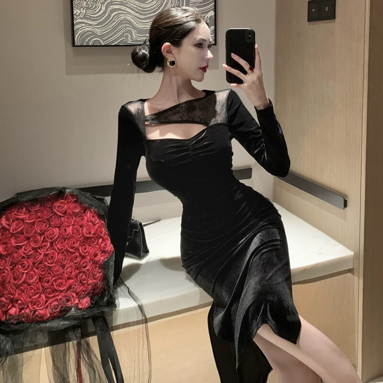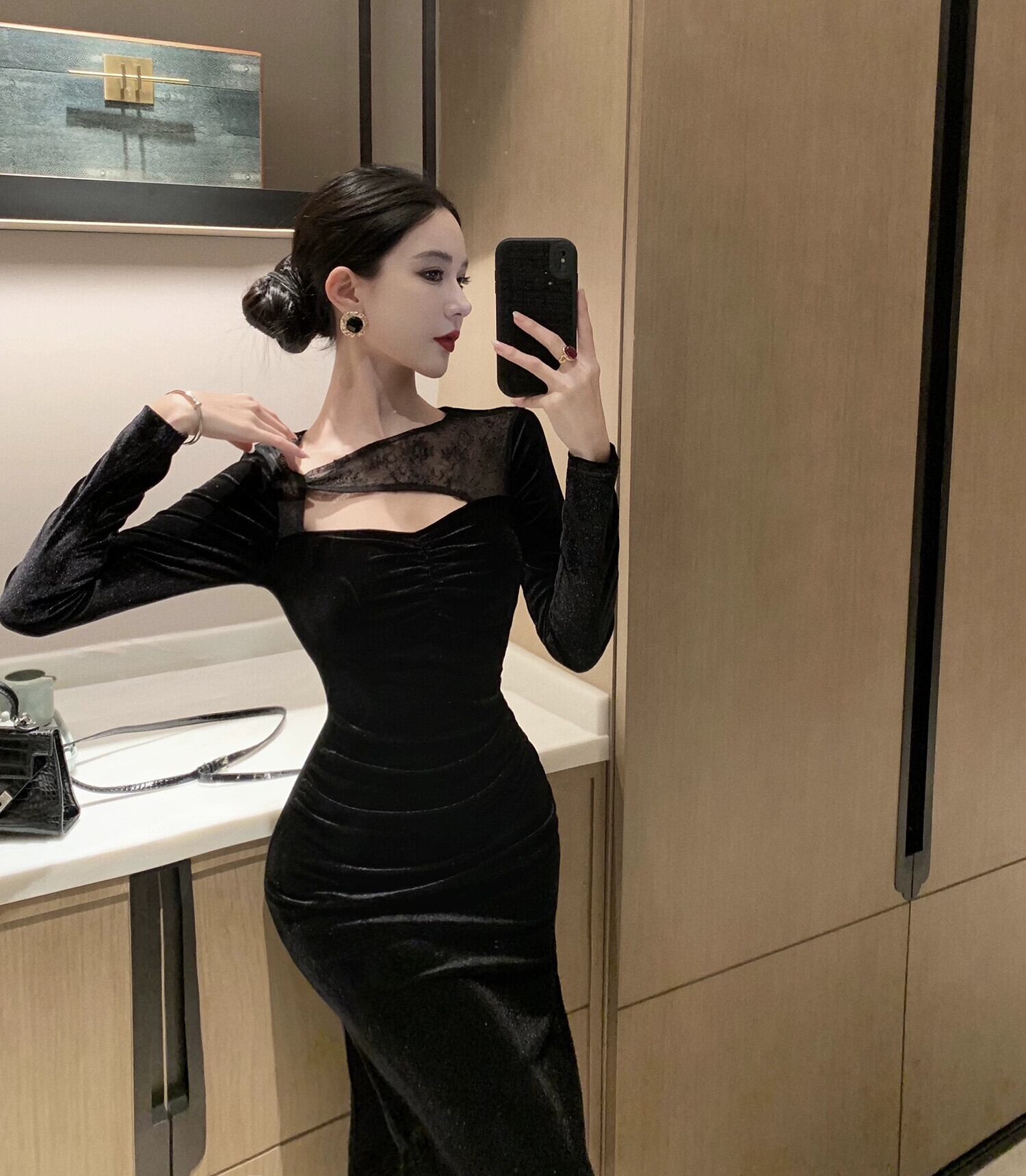 バンケットイブニングドレス、高級女性年次総会、フレンチセクシーな中空スラントネック、オフショルダーブラックゴールドベルベットドレス yeyij95185912270