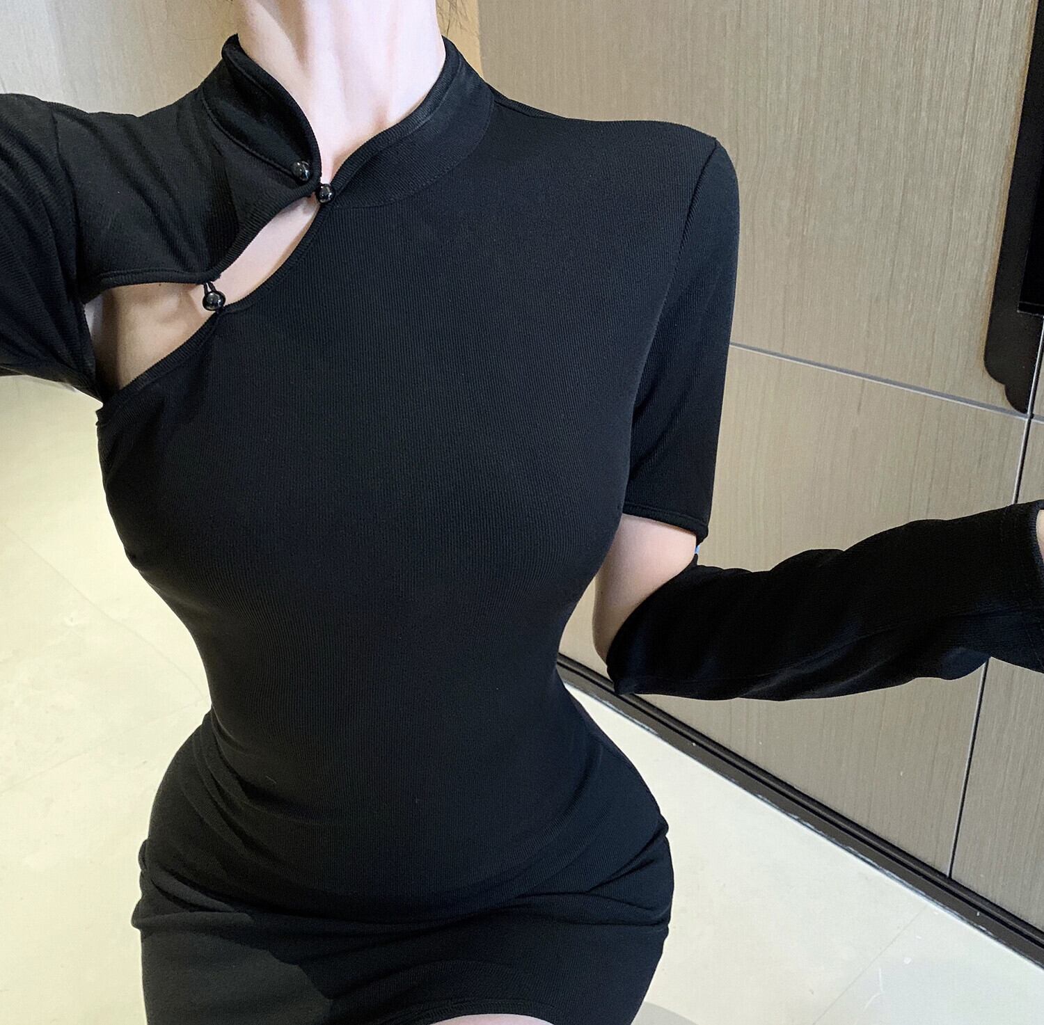 生放送服女性アンカー服セクシーな中空若いスタイル黒スリットミッドレングス修正チャイナドレス ブラック yeyij64564474215