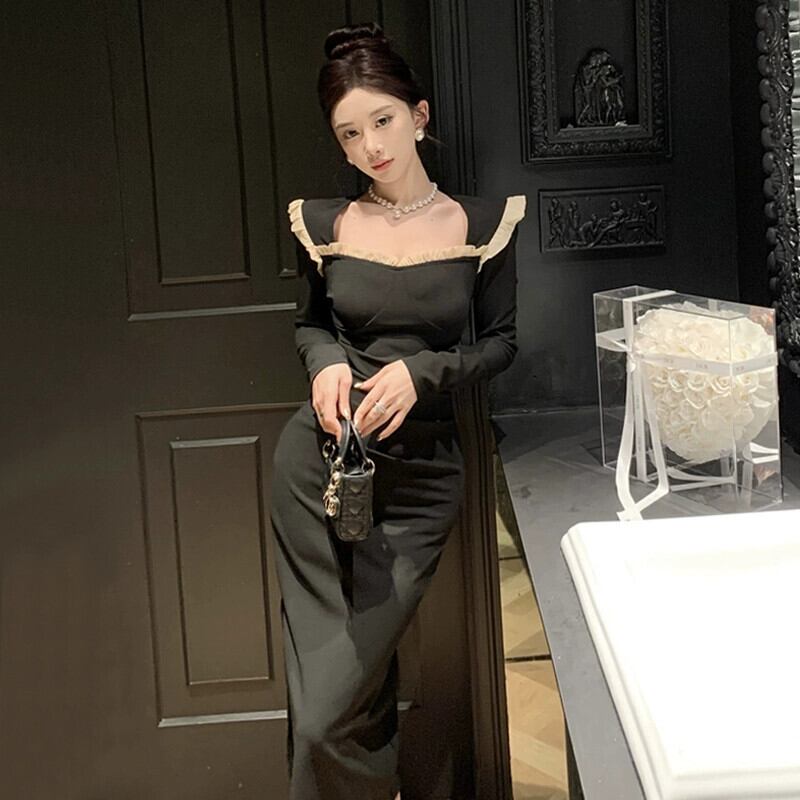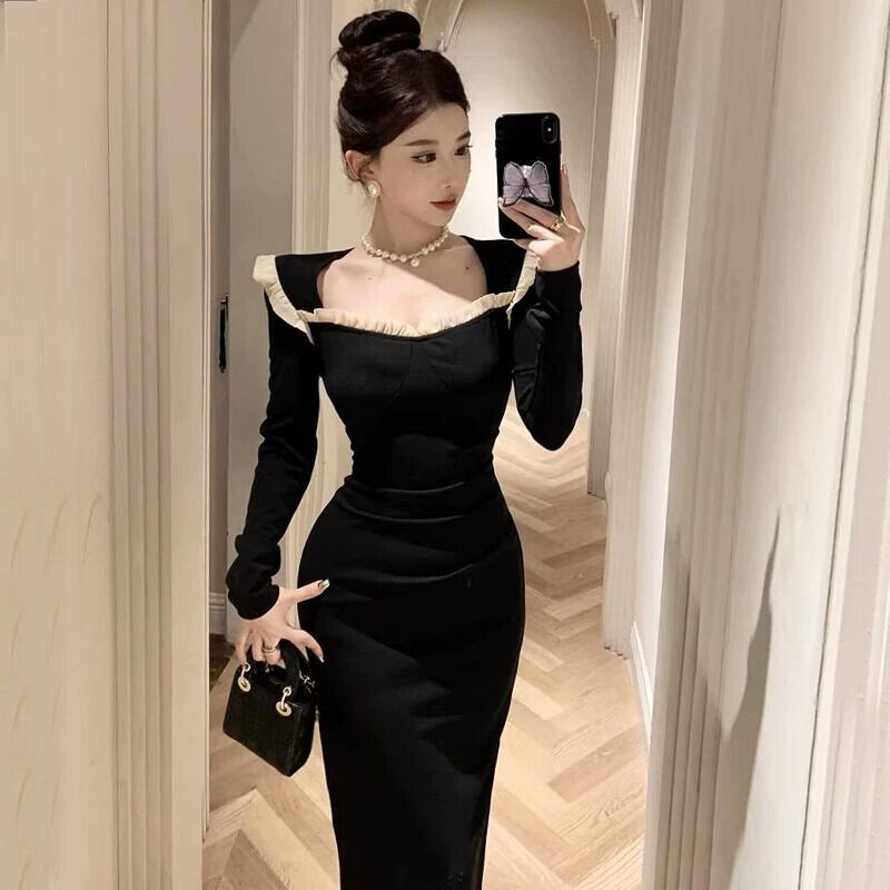 フレンチライトイブニングドレス女性、ハイエンドブラックヘップバーンスタイルスクエアネックスリム長袖ミッドレングスドレス ロング スクウェア yeyij26745470479