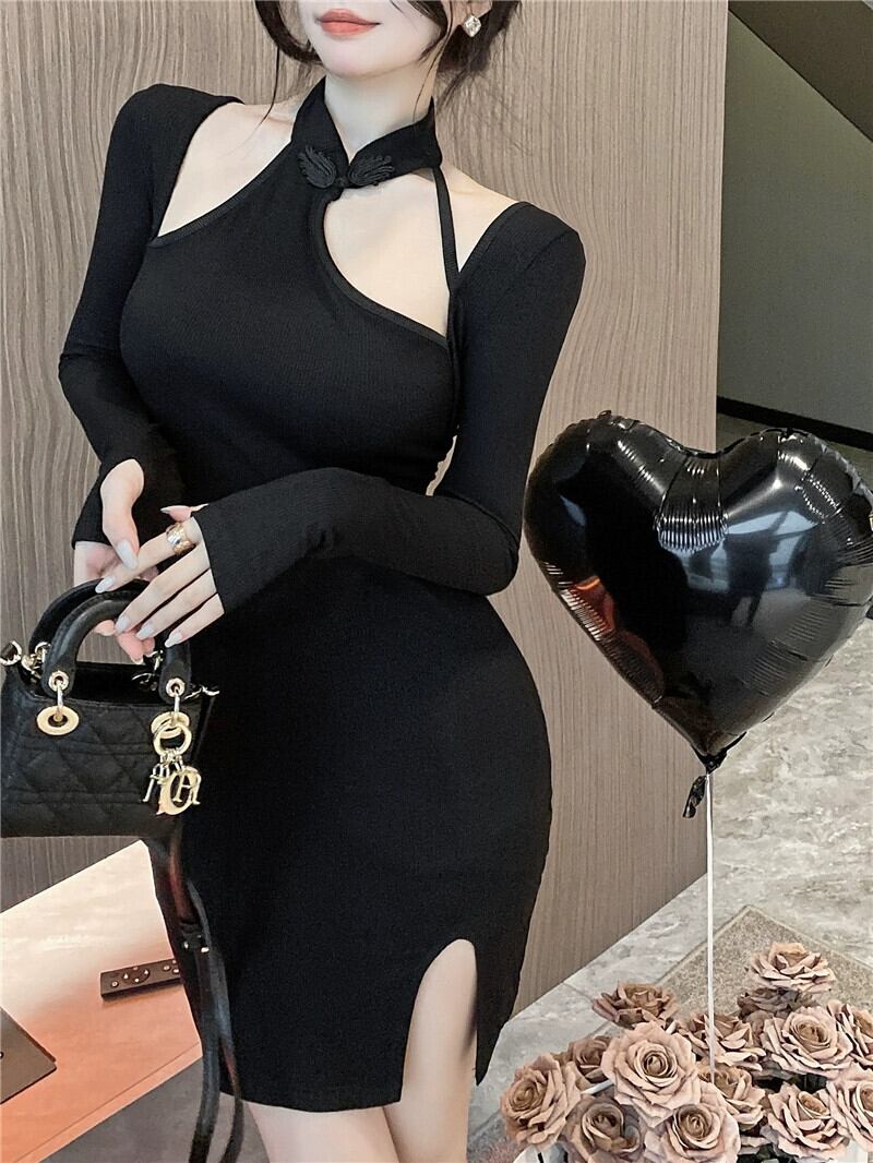 生放送服女性アンカー pogenic 若い黒のセクシーなオフショルダー ホルターネック修正されたチャイナ ドレス ブラック yeyij53675438413