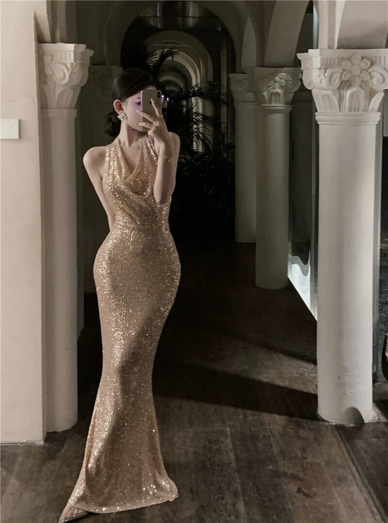 スパンコール付きのイブニングドレスの女性、高級バンケットトーストドレス、ホストフロアレングスドレス、セクシーな背中の開いたホルターネックドレス yeyij14748024044