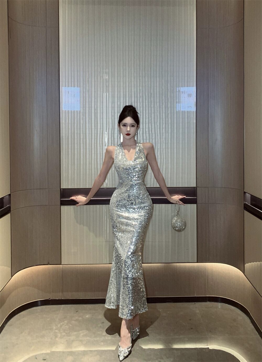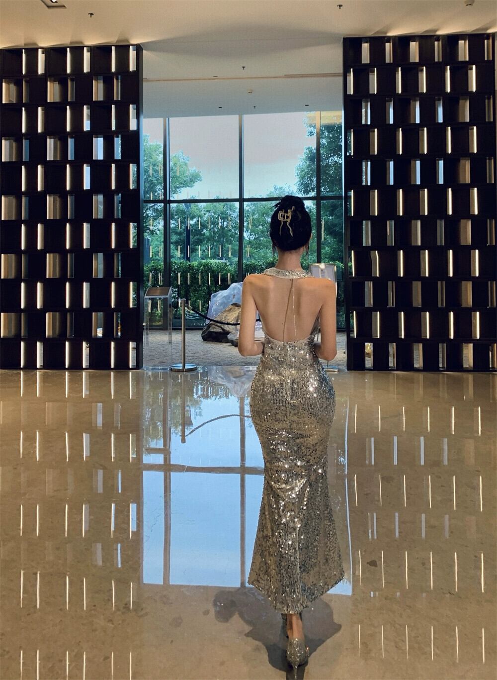 ニッチバンケットイブニングドレスの女性 2023 新しいハイエンドブリンブリンスパンコールロングスカートセクシーな大きな背中の開いたドレス yeyij58574975208