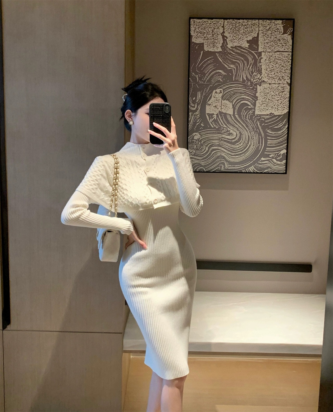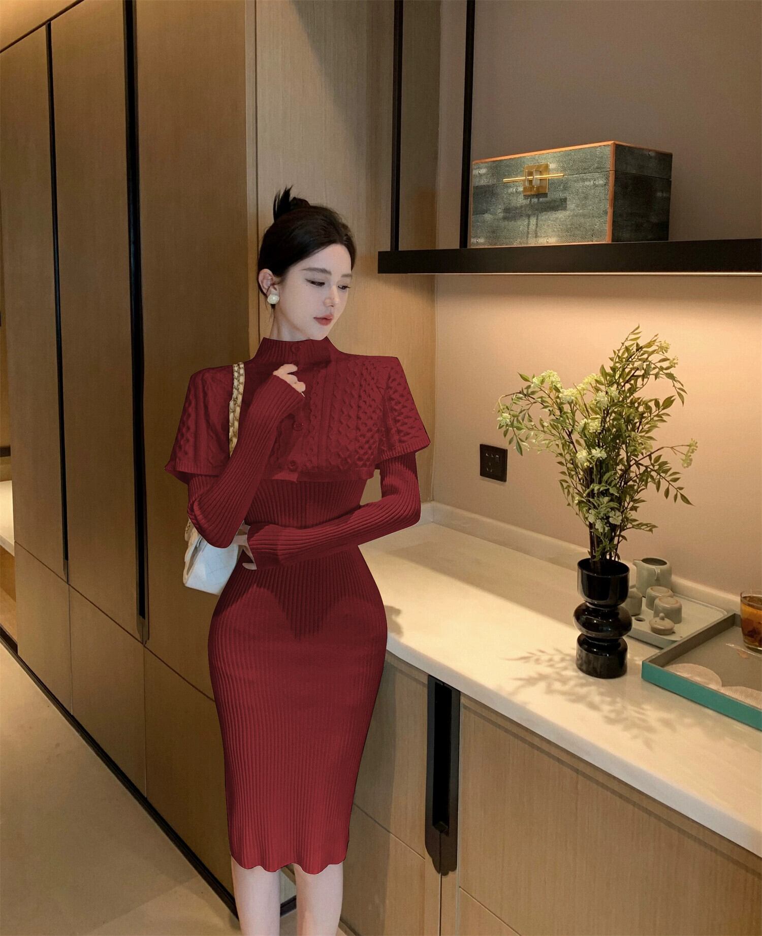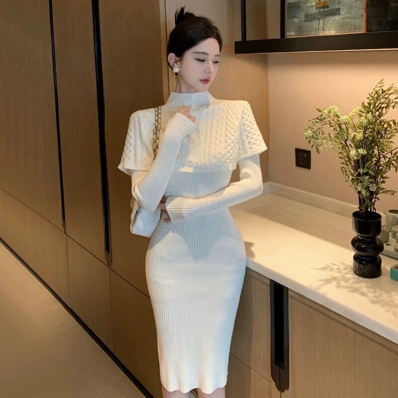 スモールドレス、ソーシャライト高級スーツ、スタンドカラーケープ、ショール、ミディアム丈長袖ニットワンピース2点セット ロング yeyij75883872114