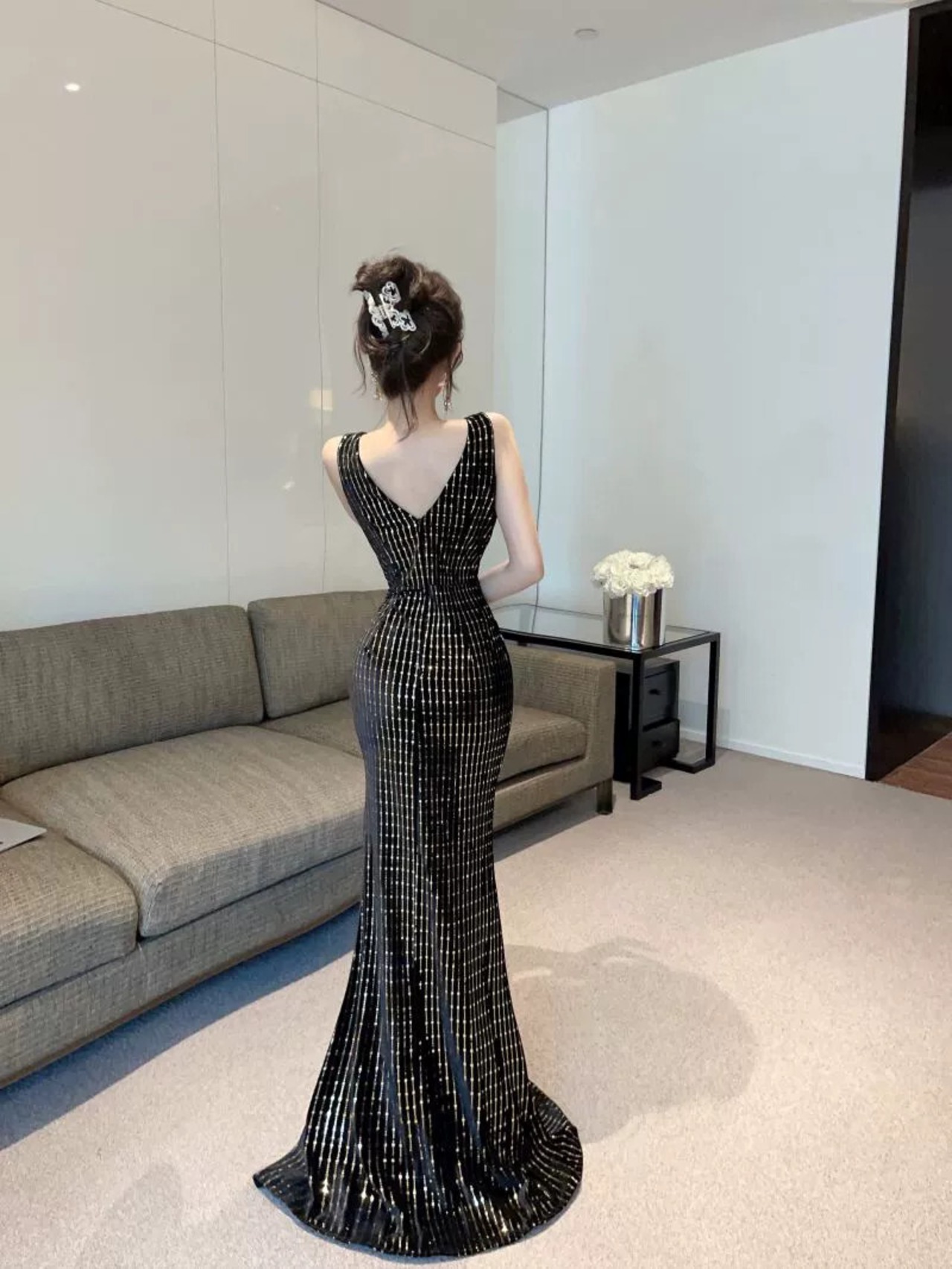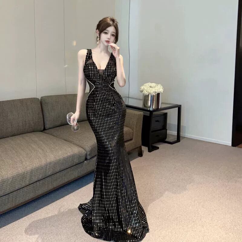 黒のイブニングドレスロングスカート女性ハイエンドライト高級ニッチハイエンドスパンコールセクシーなローカットディープ V ネックドレス ブラック Vネック yeyij22720915352